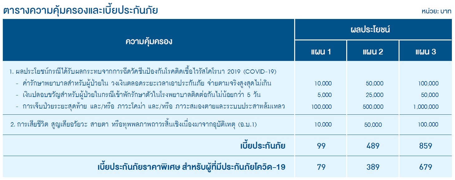 ราคาคุ้มค่า เบี้ยประกันภัยเริ่มต้น 99 บาท และสำหรับผู้ที่มีกรมธรรม์ประกันภัยโควิด-19 กับ บริษัทประกันภัยใดก็ได้ จ่ายเบี้ยประกันภัย ในราคาพิเศษ